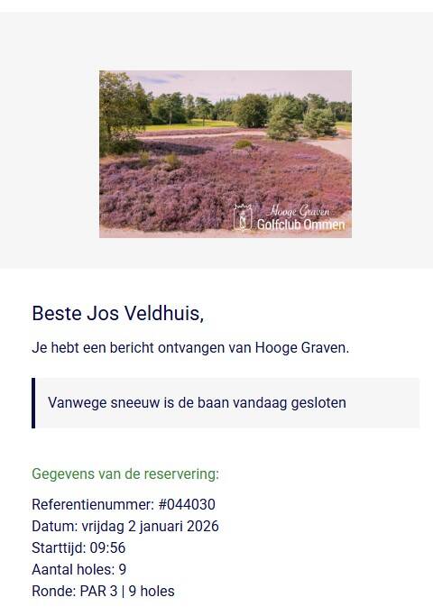 - 2-1-2026. Het heeft licht gesneeuwd en de baan is gesloten. We hebben niet gegolfd. Het blijkt dat op de website de baanstatus "Open" wordt aangegeven. Er is verwarring.