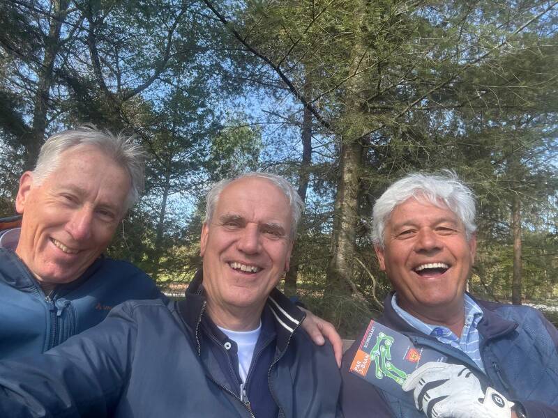 Peter, Bert en Jos. We spelen i d middag om 14.00 uur. Lekker zonnetje. Wel windje. Paar wolken.